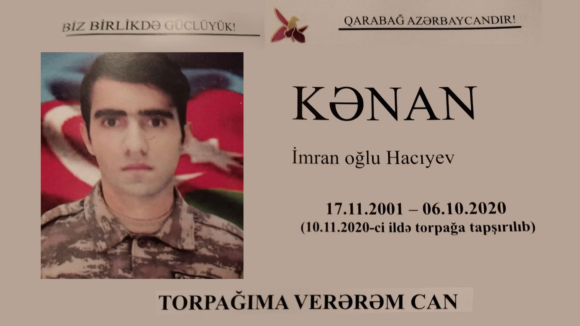 Bu gün Vətən müharibəsi şəhidi Hacıyev Kənan İmran oğlunun şəhadətə ucaldığı gündür.