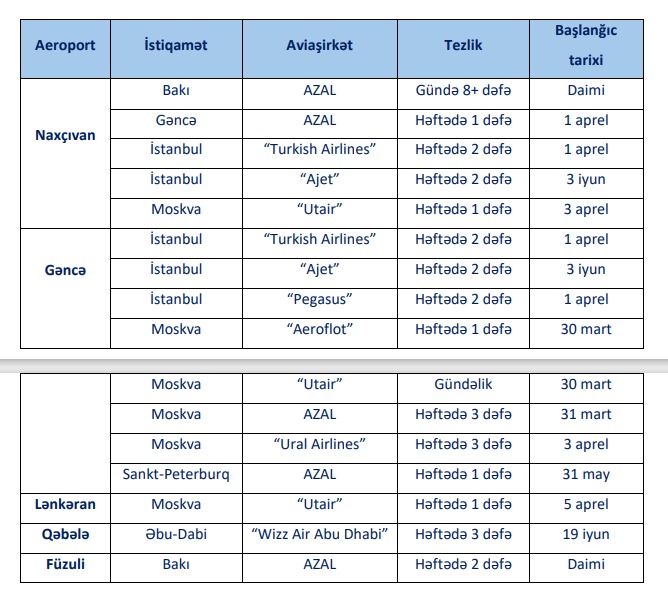 Yaz-yay uçuş cədvəli çərçivəsində Azərbaycanın regional hava limanlarından uçuşların sayı artırılır və yeni istiqamətlər əlavə olunur.