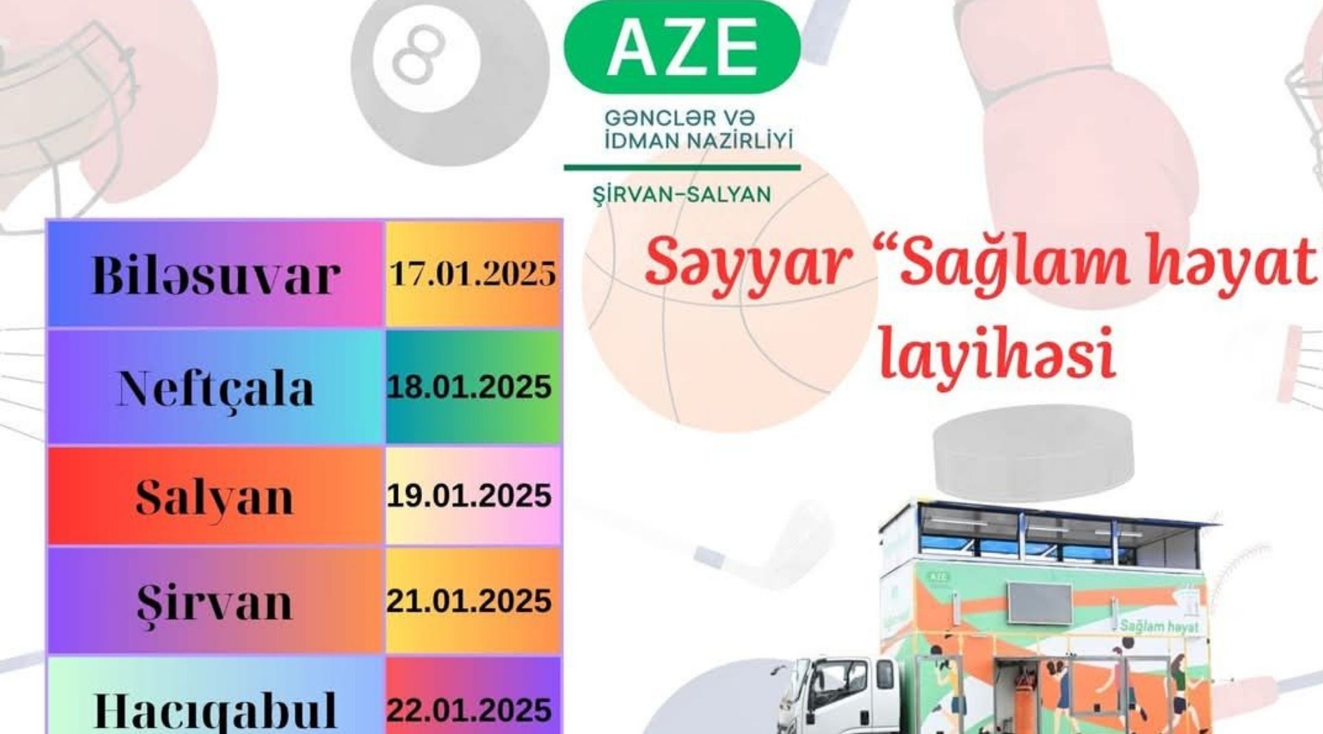 Səyyar “Sağlam həyat” layihəsi Heydər Əliyev adına parkında yanvarın 17-si saat 10:00-da başlayacaq. Burada idman həvəskarları öz yaş qrupları üzrə müxtəlif idman normativlərini yerinə yetirərək müvafiq sertifikatlarla təltif olunacaqlar.