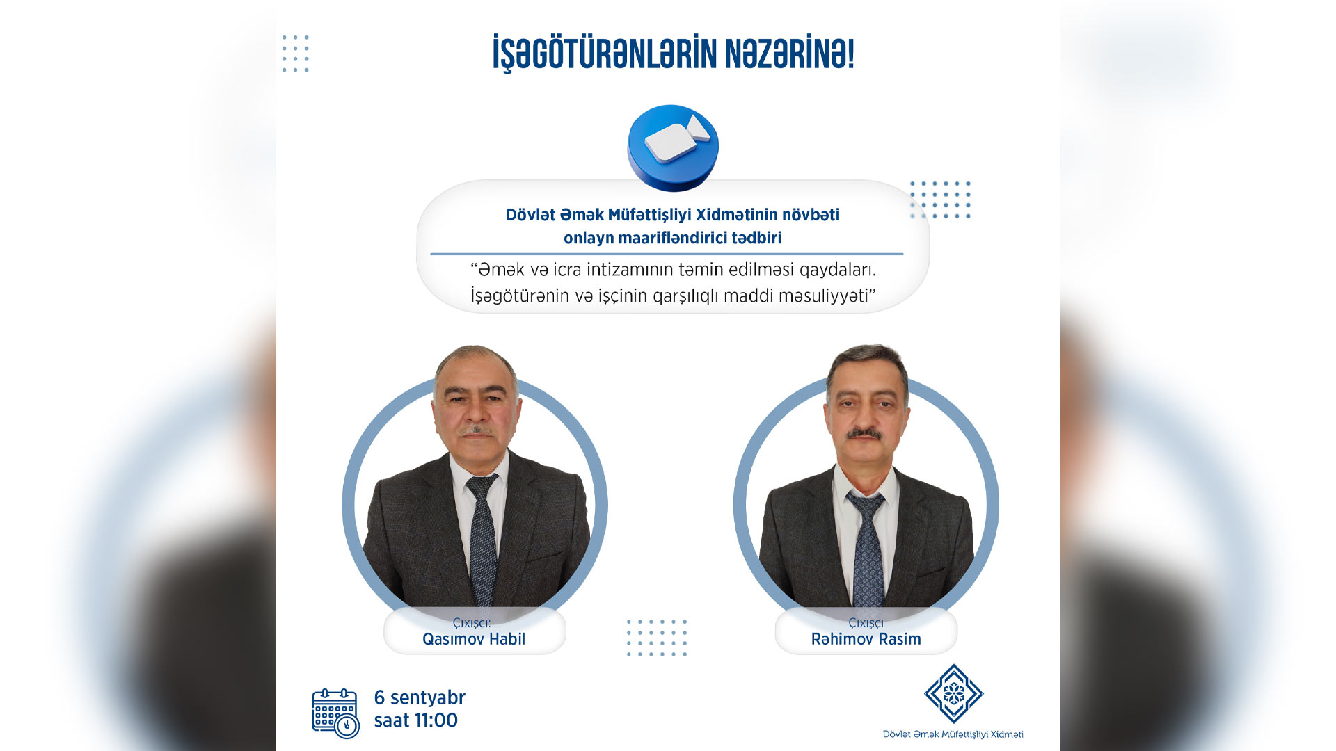 Onlayn tədbirlərdə iştirak etmək istəyən işəgötürənlər qeydiyyatdan keçmək üçün Dövlət Əmək Müfəttişliyi Xidmətinə elektron qaydada ([email protected]) müraciət edə bilərlər. Müraciətdə müəssisənin adı, iştirak edəcək şəxsin ad, soyad, ata adı, əlaqə nömrəsi və e-mailinin qeyd olunmağı xahiş olunur.