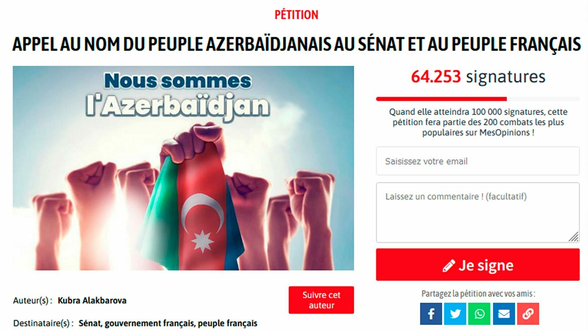 Daha öncə xəbər verdiyimiz kimi, Fransa Senatı 15 noyabr tarixində müzakirəyə çıxaracaq Azərbaycana qarşı sanksiya paketi hazırlayıb. Bunun qarşısını almaq üçün sıravi azərbaycanlılar Fransanın Mesopinions.com saytında petisiya yaradıb və bu müraciət artıq 64 mindən çox səs toplayıb.