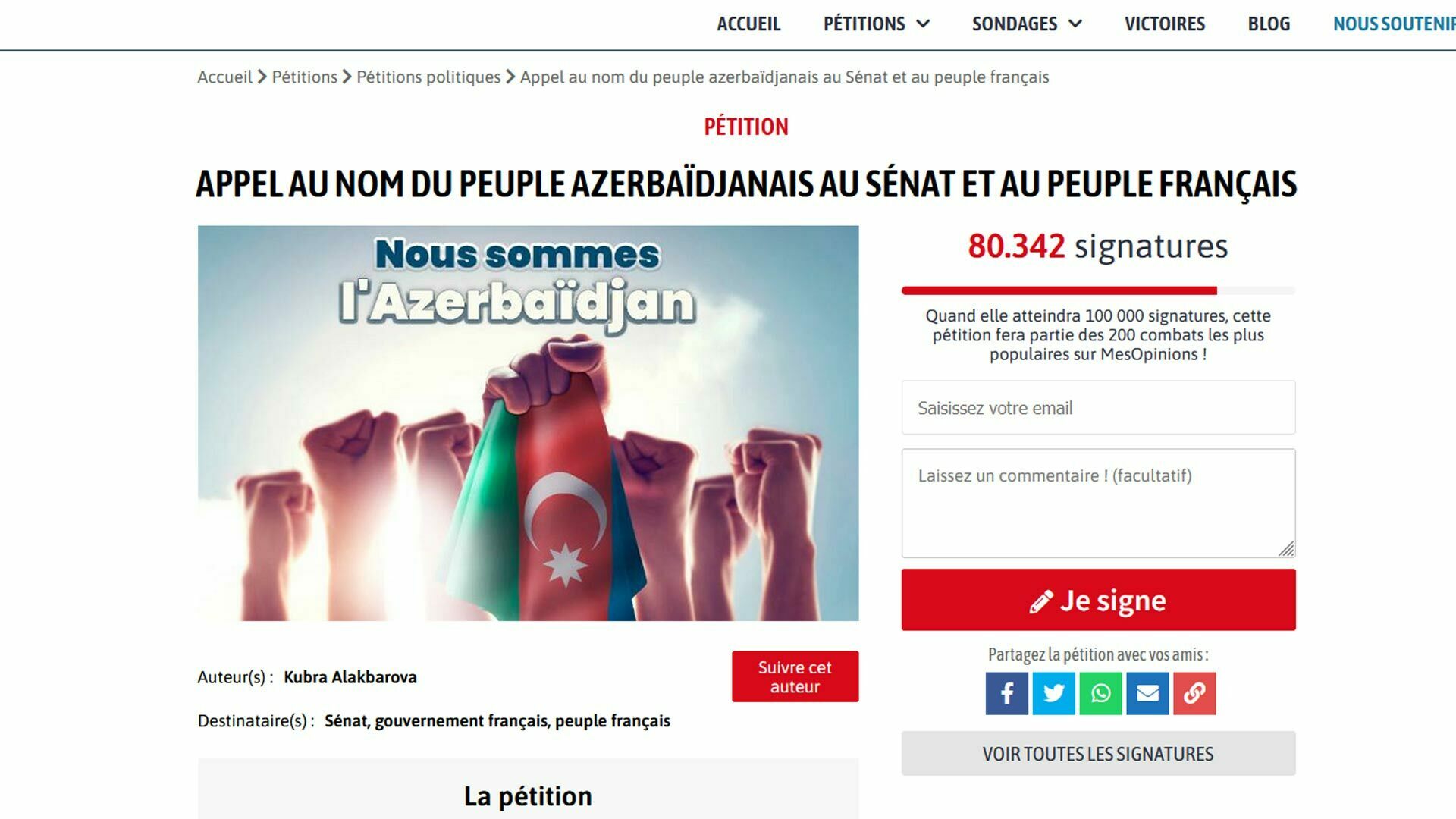 Daha öncə xəbər verdiyimiz kimi, Fransa Senatı Azərbaycana qarşı sanksiya paketi hazırlayıb və 15 noyabr tarixində müzakirəyə çıxaracaq. Bunun qarşısını almaq üçün sıravi azərbaycanlılar Fransanın Mesopinions.com saytında petisiya yerləşdiriblər.