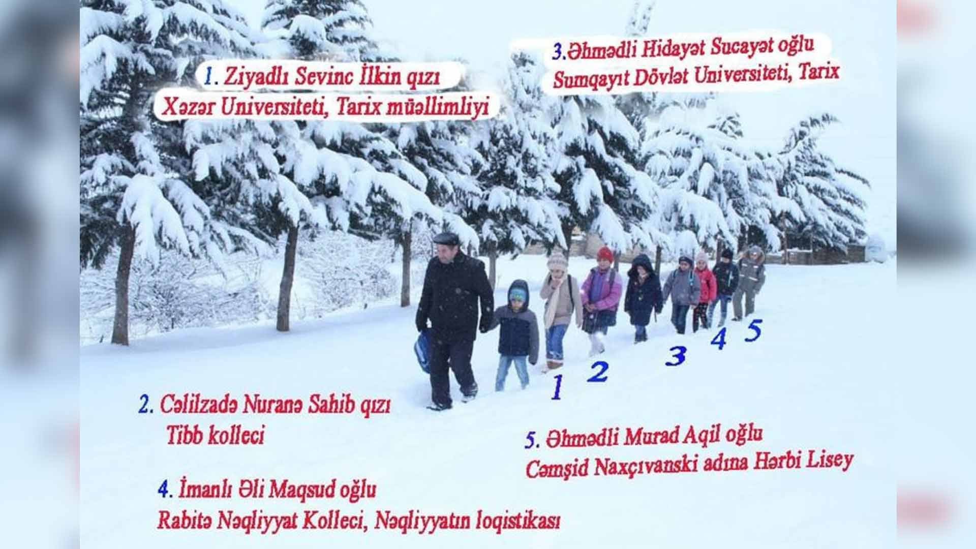 Cenublu.az Ölkə.az-a istinadən xəbər verir ki, fotoda məktəbin müəllimi Nəcəf Məhhərmov qarlı-şaxtalı havada aşağı sinif şagirdlərini əlindən tutaraq məktəbə aparır. İndi isə bu şagirdlər ali məktəb və kolleclərə qəbul olublar.