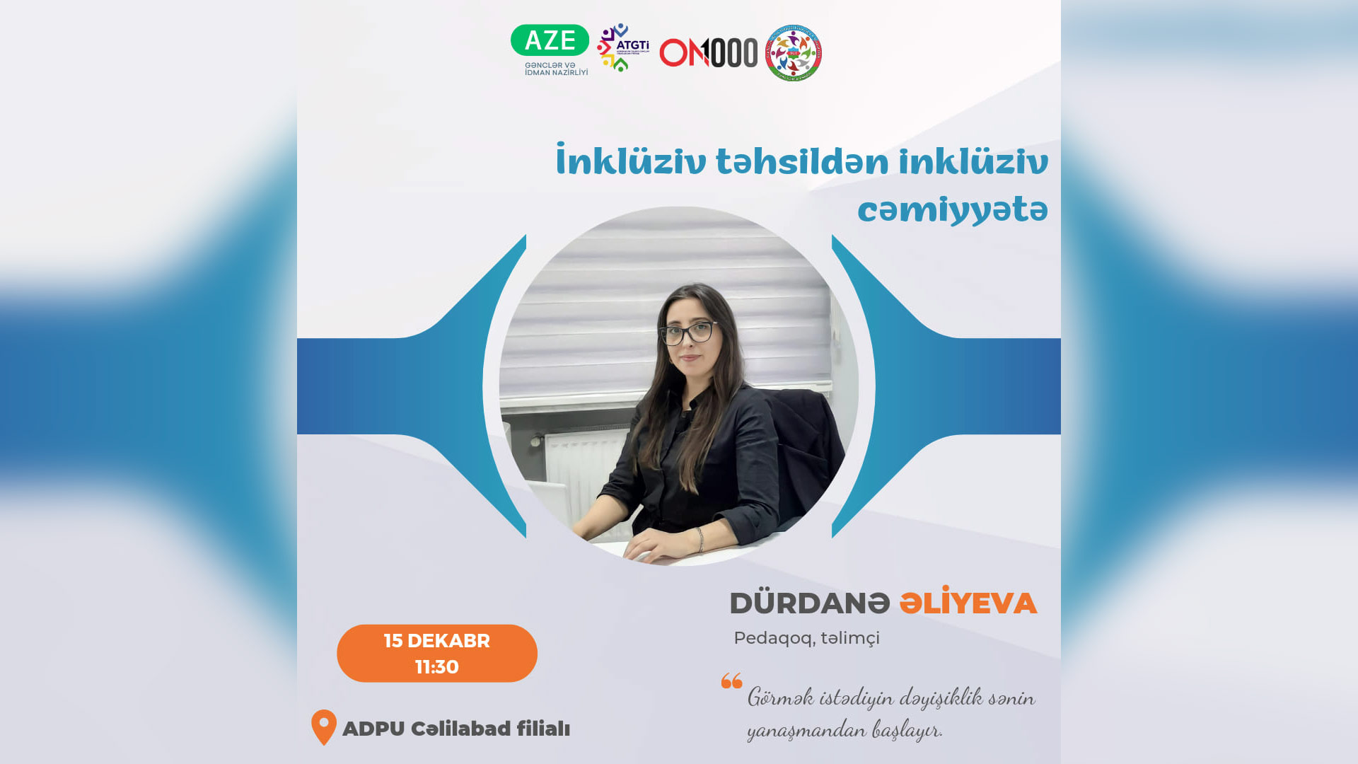 ON1000 proqramı çərçivəsində Tələbə Gənclər Təşkilatının təşkilatçılığı ilə ADPU Cəlilabad filialının baş müəllimi, təlimçi Dürdanə Əliyevanın "İnklüziv təhsildən inklüziv cəmiyyətə" adlı təlimi keçiriləcək.