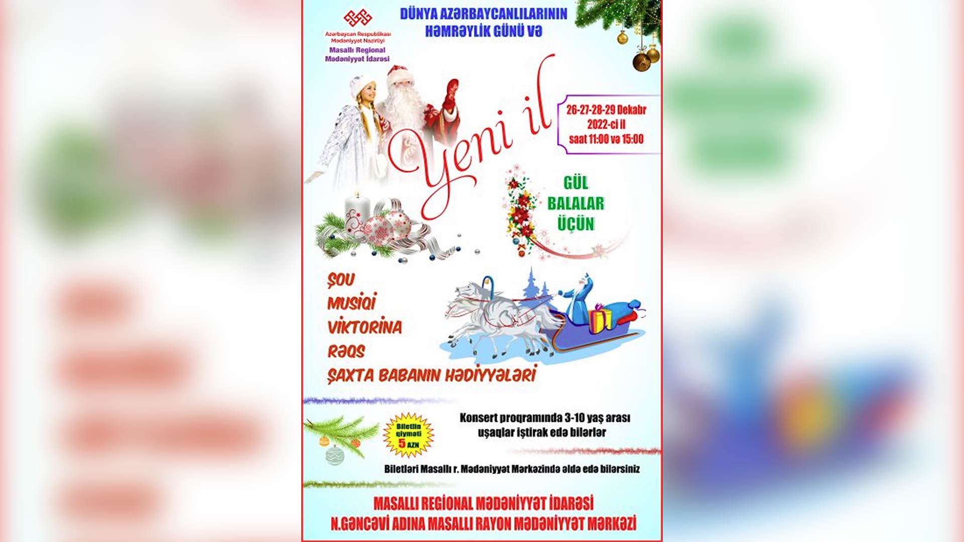 Şou-proqramlar 26-29 dekabr aralığında hər gün baş tutacaq. Nizami Gəncəvi adına Masallı rayon Mədəniyyət Mərkəzində 3-10 yaş arası uşaqlar üçün "Yeni il" şənliyi keçiriləcək.