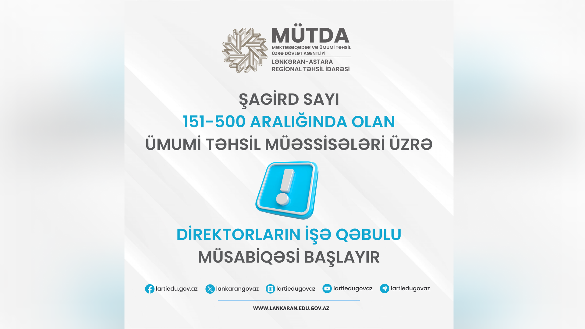 Lənkəran-Astara Regional Təhsil İdarəsinin tabeliyində yerləşən və şagird sayı 151-500 aralığında olan ümumtəhsil müəssisələri üzrə direktor vəzifəsinə işə qəbul prosesi ilə bağlı sənəd qəbuluna başlanılıb.