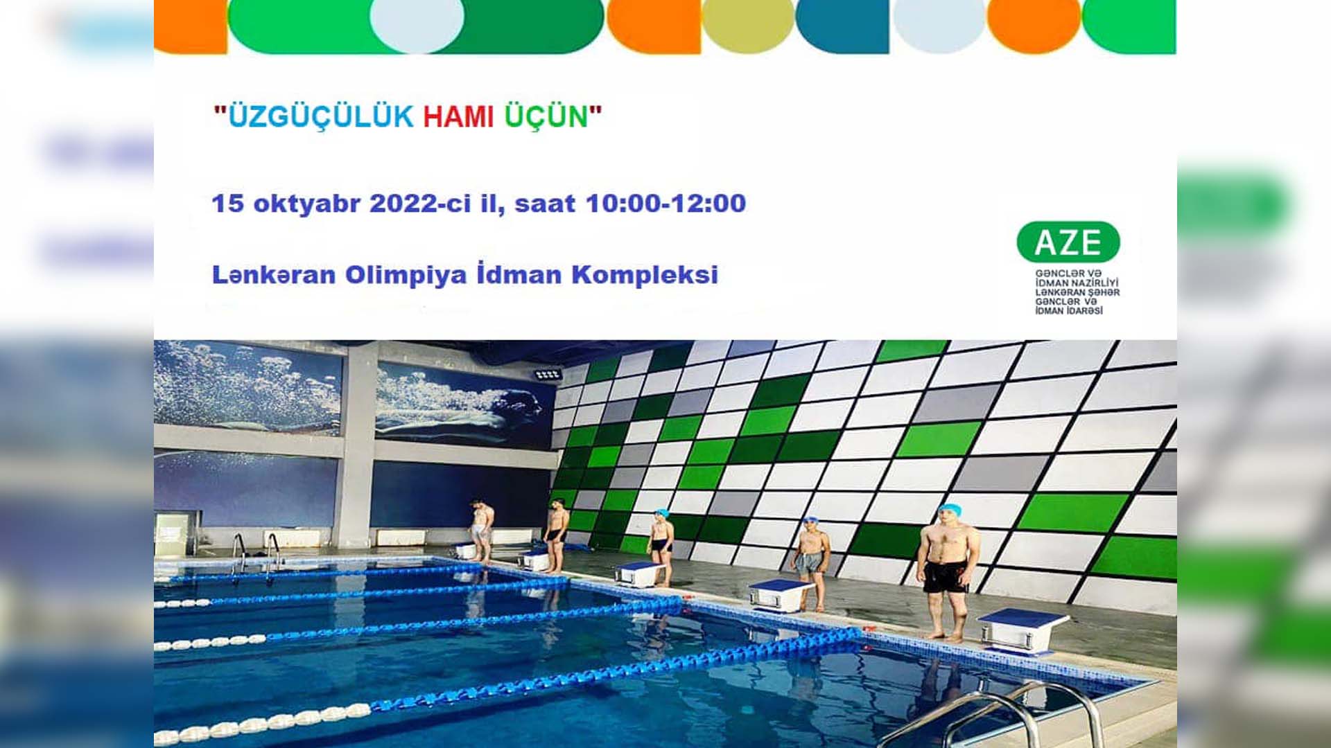 Lənkəran Olimpiya İdman Kompleksində “İdman hamı üçün" layihəsi çərçivəsində “Üzgüçülük hamı üçün” adlı açıq idman tədbiri keçiriləcək. Bu haqda məlumatı Cenublu.az bu gün, 13 oktyabr tarixində Lənkəran Şəhər Gənclər və İdman İdarəsinə istinadən verir.