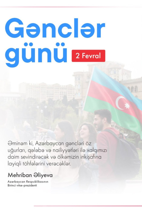 Birinci vitse-prezident Mehriban Əliyeva 2 Fevral - Azərbaycan Gəncləri Günü münasibətilə rəsmi "Instagram" hesabında paylaşım edib.